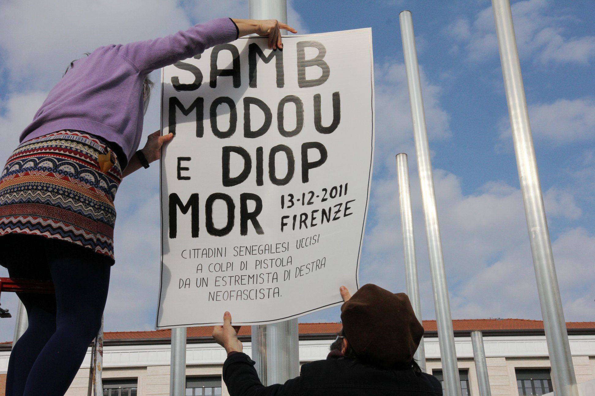 Di fronte alla Stazione di Reggio Emilia, su ognuno dei 24 pali della rotonda, sono stati affissi i nomi di persone uccise con una matrice razzista in Italia dal 1979 ad oggi.