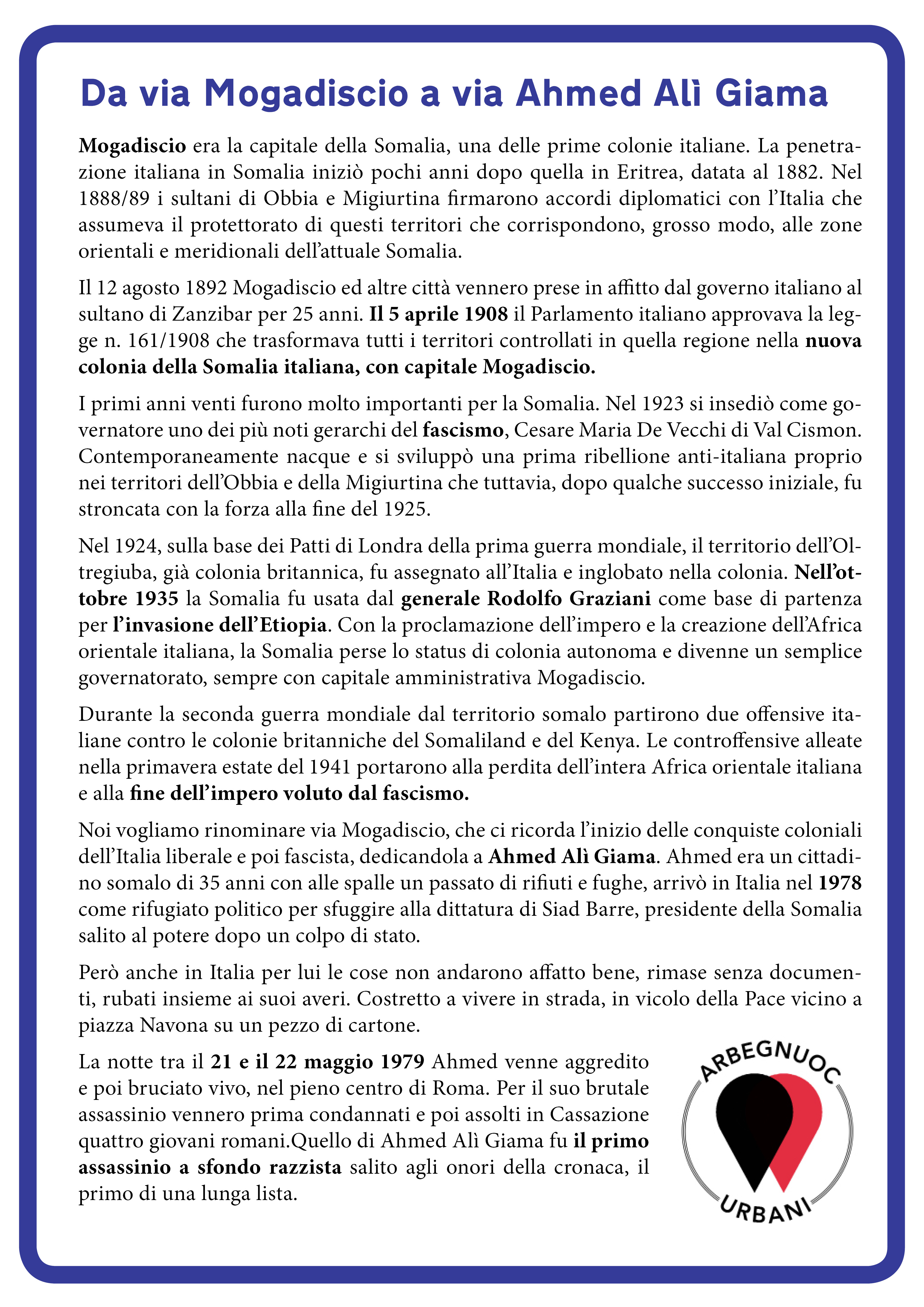Così via Mogadiscio è diventata via Ahmed Alì Giama in ricordo del primo assassinio a sfondo razzista salito agli onori della cronaca nel 1979.