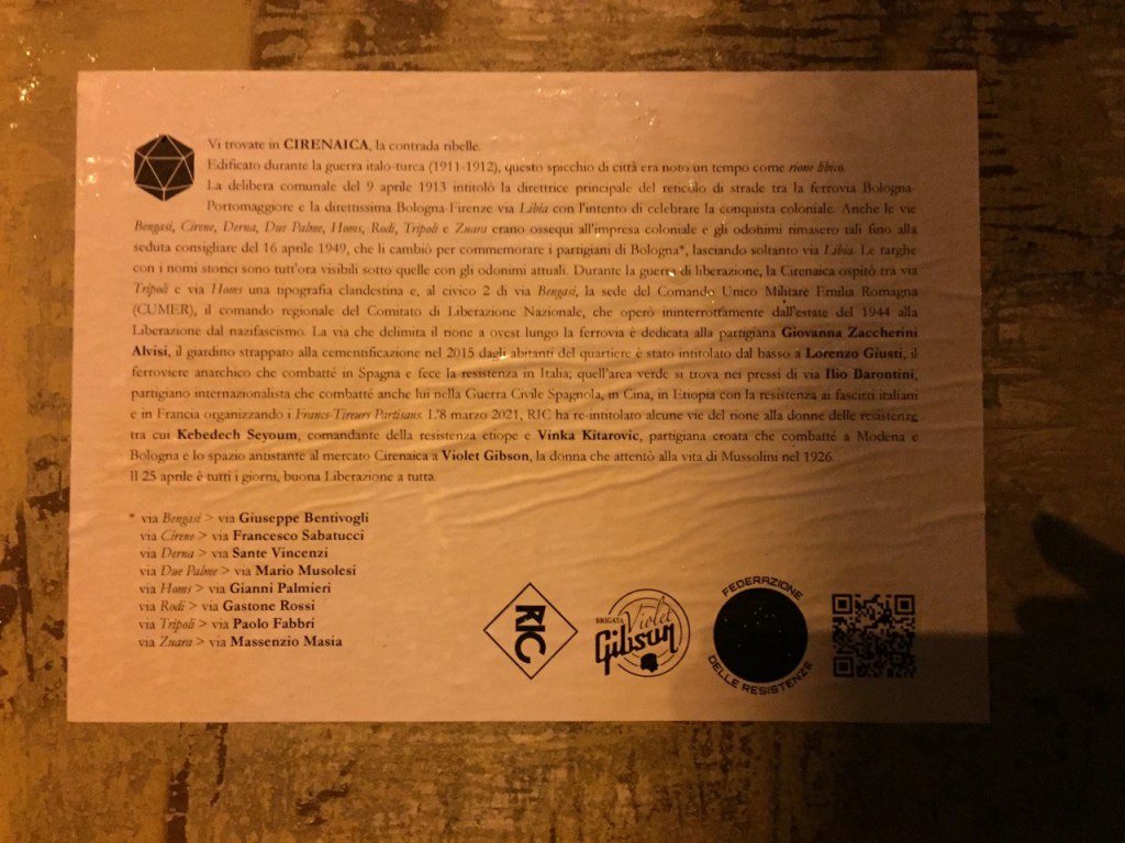 Questa notte è stato celebrato un rito propiziatorio. Sono stati convocati alcuni dei genii loci, i numi tutelari, che presiedono la contrada ribelle. L’evocazione è avvenuta sul ponte di via Libia, uno degli elementi architettonici più caratteristici della Cirenaica, nella piazzetta del mercato rionale già ribattezzato largo Violet Gibson e in mura Anteo Zamboni. Tutte le energie volitive si sono concentrate allo scopo di alterare l’andamento in-naturale degli eventi, l’incantesimo è stato lanciato, gli spiriti del luogo hanno risposto e si sono materializzati per svelarci l’inganno della resilienza, ricordarci il potere della resistenza e liberarci dalla magia nera che ci ha tenuti in scacco per troppo tempo. Buona Liberazione a tuttə.