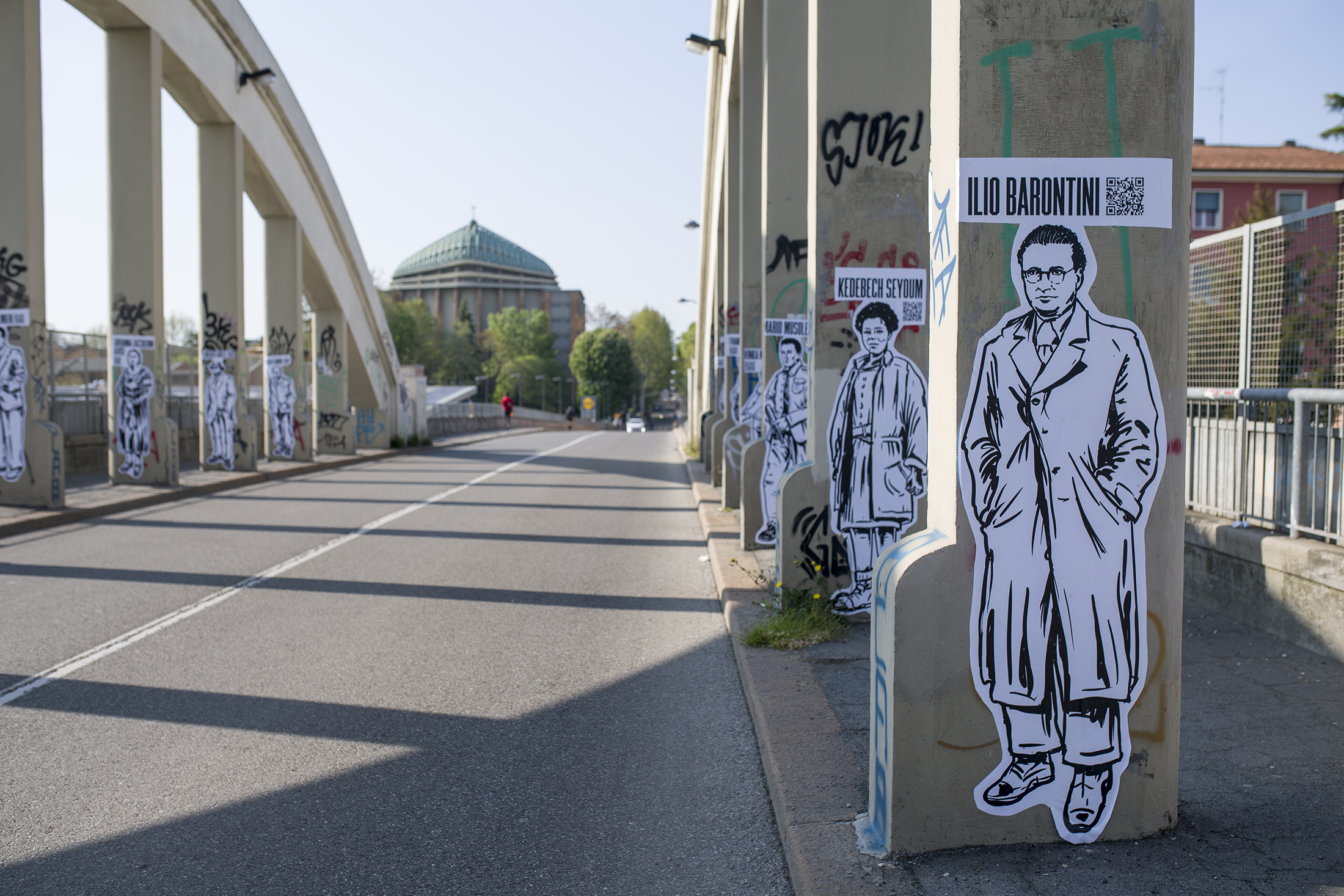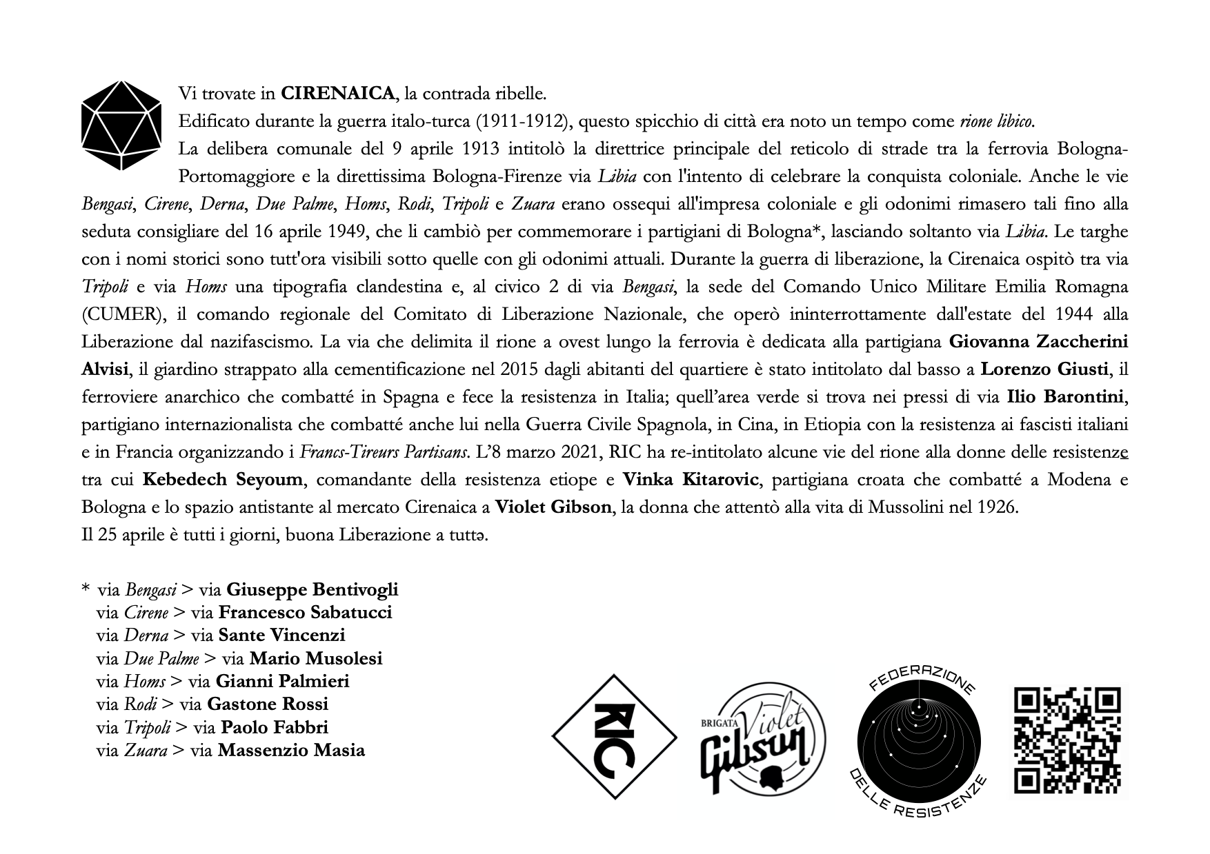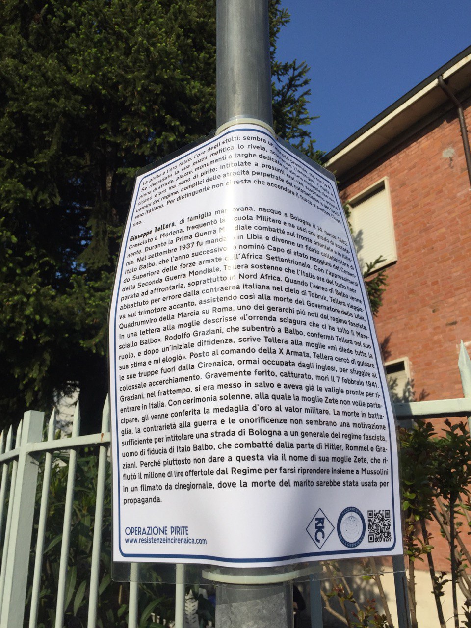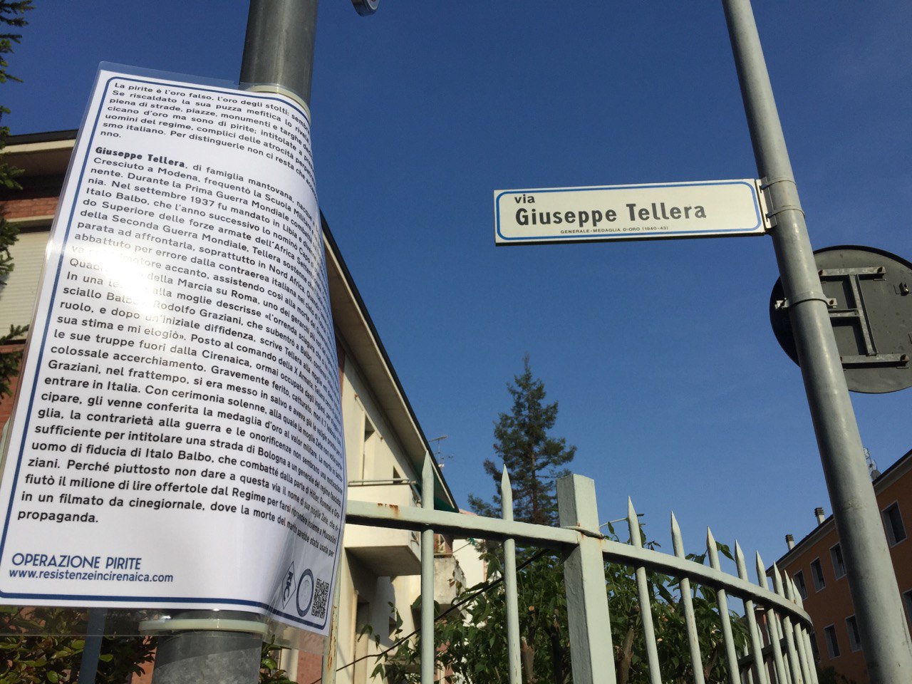 A Bologna, l’evocazione è avvenuta sul ponte di via Libia, uno degli elementi architettonici più caratteristici della Cirenaica, nella piazzetta del mercato rionale già ribattezzato largo Violet Gibson e in mura Anteo Zamboni. Tutte le energie volitive si sono concentrate allo scopo di alterare l’andamento in-naturale degli eventi, l’incantesimo è stato lanciato, gli spiriti del luogo hanno risposto e si sono materializzati per svelarci l’inganno della resilienza, ricordarci il potere della resistenza. Nel rione della Barca invece è stato compiuto un esorcismo grazie all’Operazione Pirite, un’operazione alchemico-narrativa ispirata alla mappa Viva Zerai! che svela l’inganno dell’oro falso spacciato per vero delle medaglie conferite a fascisti, colonialisti e criminali di guerra che danno il nome a quasi 170 strade, piazze, edifici ecc. in tutta Italia. Wu Ming 2 ha raccontato la storia del generale Giuseppe Tellera, vice di Badoglio e Graziani nella campagna d’Africa.