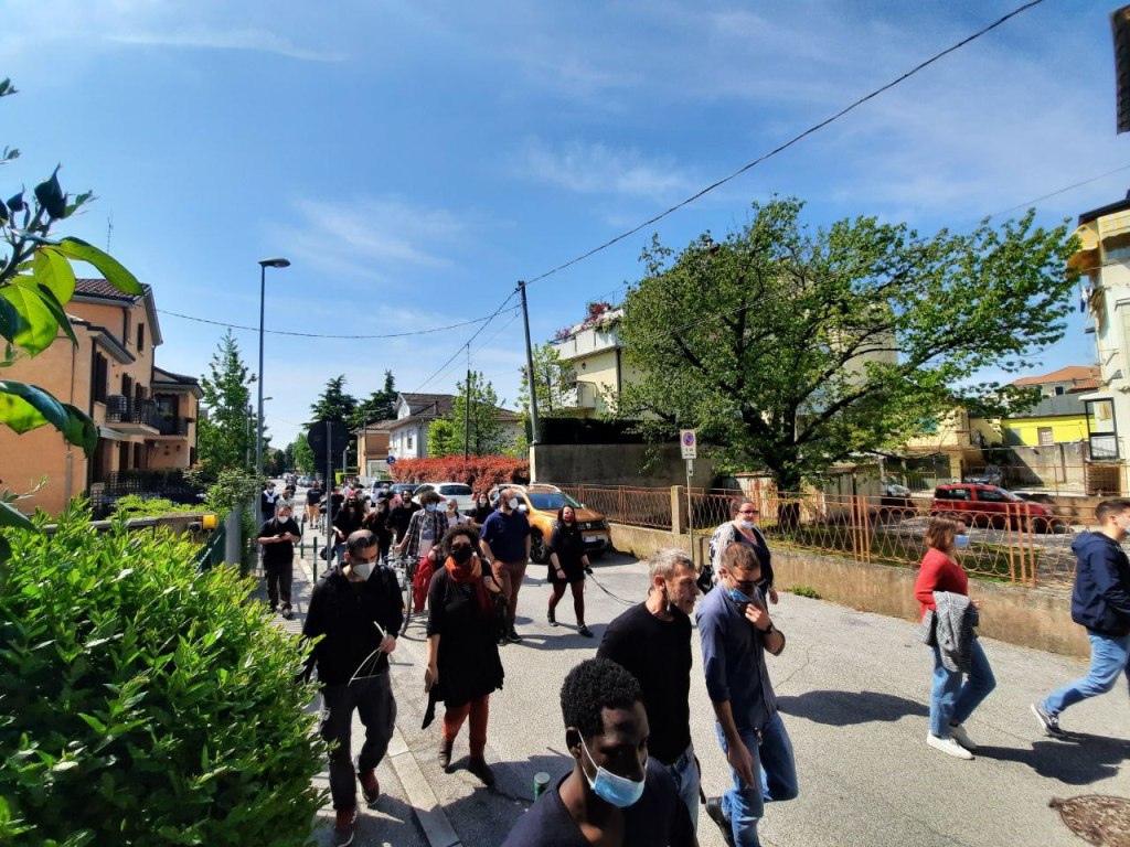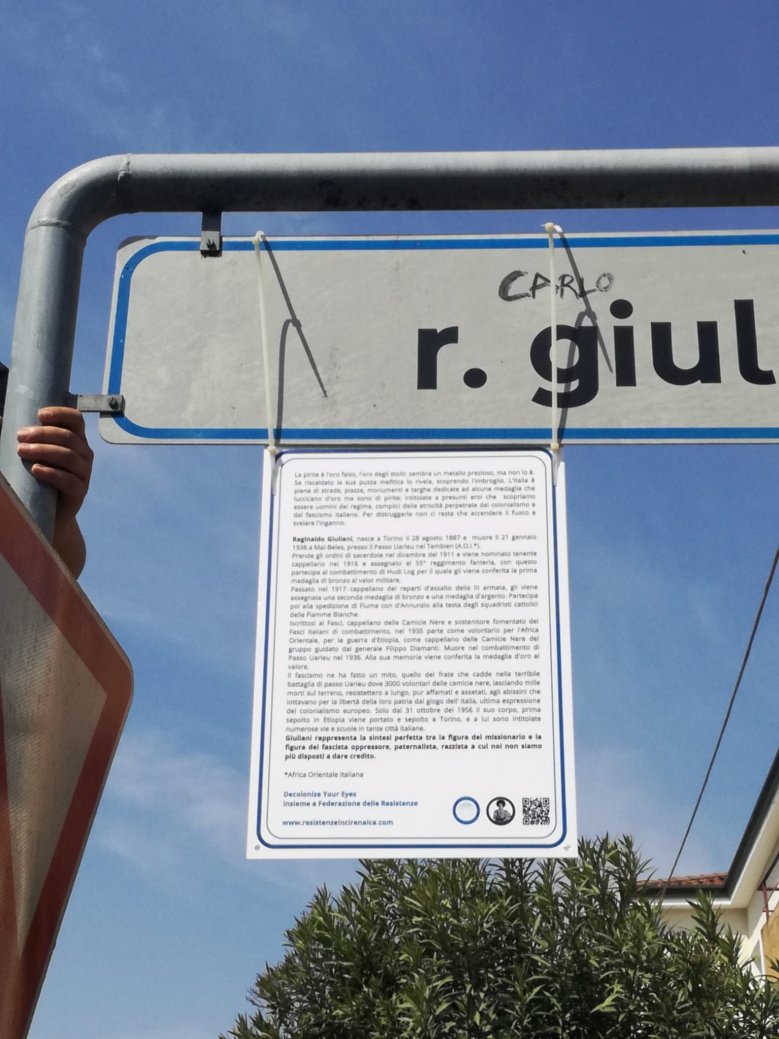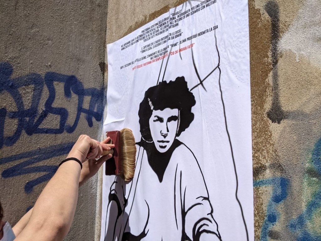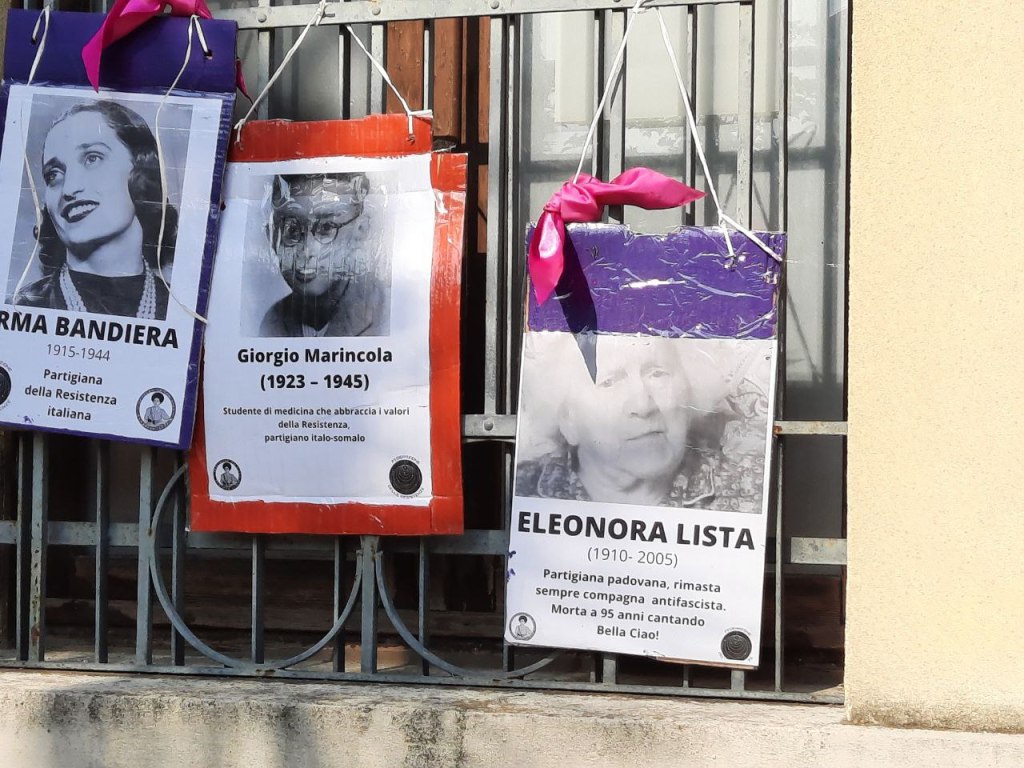 A Padova, il collettivo di Decolonize Your Eyes è tornato dove è nato grazie a diverse azioni dedicate al 25 aprile. Il rione noto un tempo come ‘Chinatown’ perché densamente popolato e storicamente di sinistra è diventato il rione Caduti della Resistenza grazie all’omonima intitolazione della piazzetta in memoria dei partigiani – tra cui alcuni del quartiere ricordati con lapidi e targhe – in cui si trova anche il rifugio antiaereo (usato soprattutto dal ’44 in poi quando i bombardamenti si rovesciarono sulla stazione Campo Marte). È un luogo carico di memorie antifasciste e di ricordi degli orrori della guerra. Memorie che si sono intrecciate a quelle della comunità composita creata con l’arrivo progressivo delle famiglie migranti. Il collettivo ha sviluppato quattro presidi in luoghi diversi: il ritrovo è stato nella piazza cuore pulsante del rione dove sono state appese alcune targhe celebrative di partigiane e partigiani (tra cui Irma Bandiera, Lidia Menapace, Giorgio Marincola e Giuliano Lenci). La seconda tappa è stata in via Palestro dove un parco senza nome è stato intitolato, con l’ affissione di una targa, a Rosetta Molinari, partigiana padovana e abitante del quartiere, mentre all’interno dell’area verde nei pressi di una piccola arena, luogo di ritrovo delle nuove generazioni meticce , è stata affissa la targa intitolata al gruppo di Resistenza meticcio Banda Mario. Nella terza tappa invece è scattata l’Operazione Pirite in via Reginaldo Giuliani in cui è stata raccontata la storia del prete camicia nera a cui sono state dedicata ben tre targhe di marmo sulle facciate delle case. La via è stata re-intitolata a un altro Giuliani: Carlo. La passeggiata circolare si è conclusa sul retro di piazza Caduti della Resistenza al rifugio antiaereo costruito tra il ’43 e il ’44 dalla comunità del rione. Anche a Padova poi è stato evocato il fantasma di Violet Gibson che ha prontamente risposto alla chiamata.