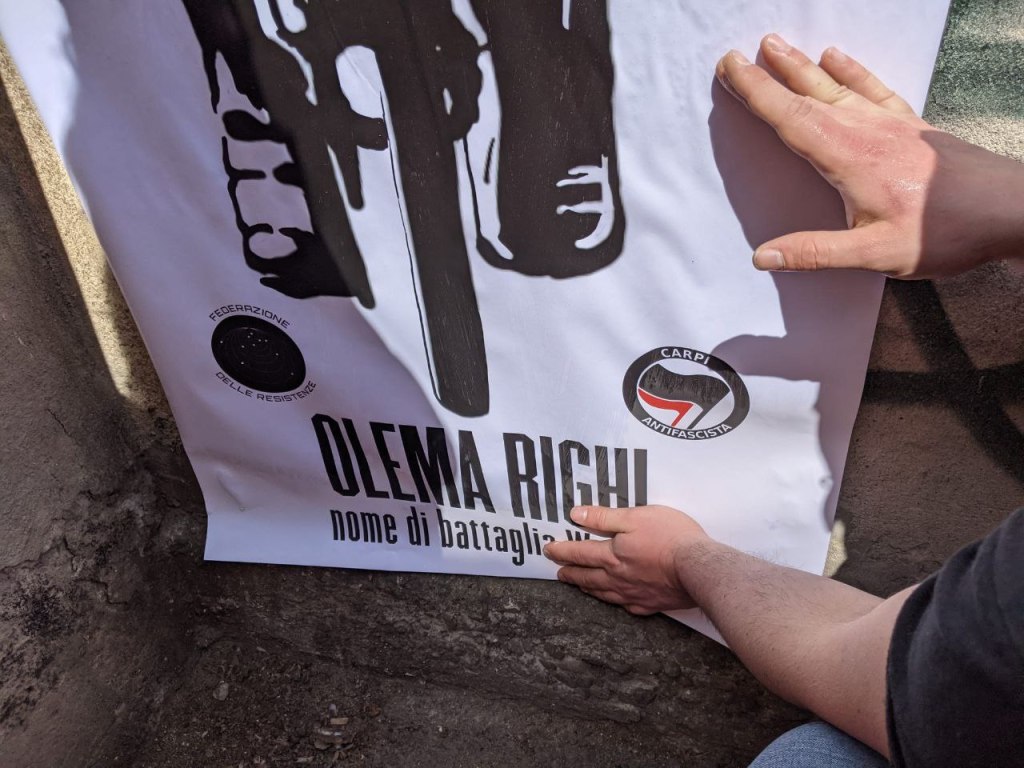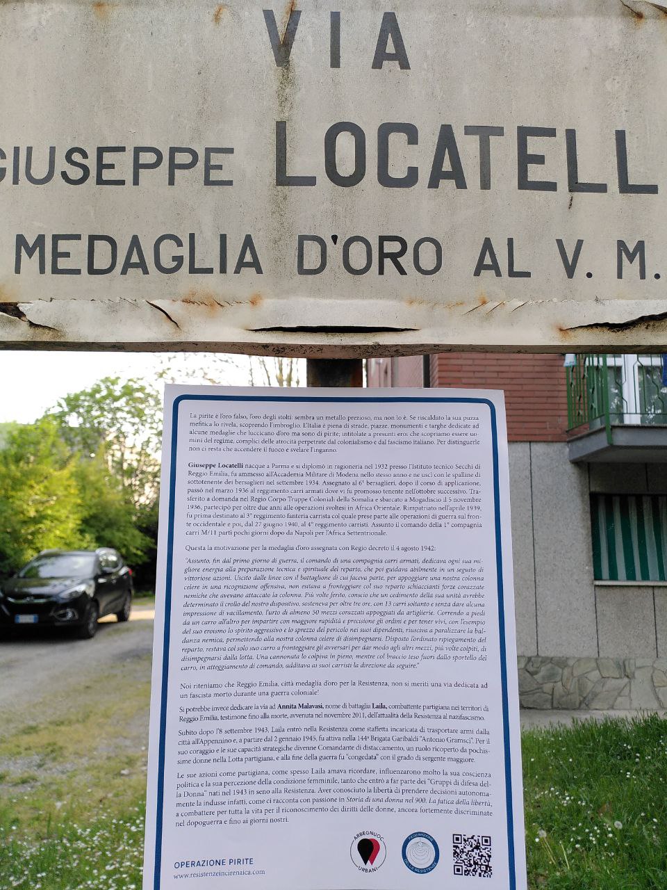 Infine gli Arbegnuoc Urbani hanno svelato la falsa medaglia d’oro dedicata a Giuseppe Locatelli, carrista morto durante le guerre di aggressione coloniale, dedicando simbolicamente la via a lui intestata a Annita Malavasi, nome di battaglia Laila, combattente partigiana.