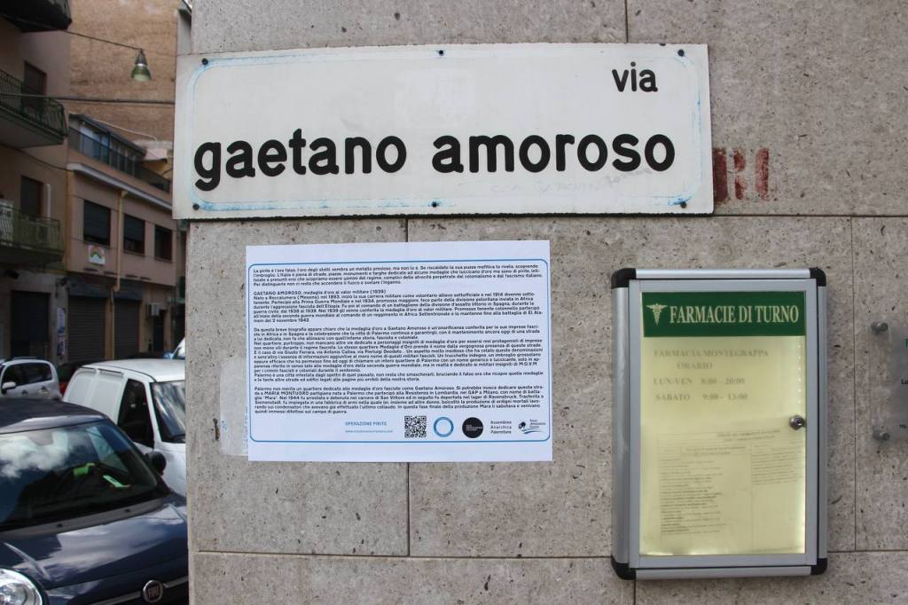 A Palermo c’è un intero quartiere dedicato ai militari fascisti che furono insigniti di medaglie d’oro per i crimini commessi in Africa e in Spagna: il quartiere Medaglie d’Oro, dove abbondano strade dedicate a infami personaggi come il fascista Gaetano Amoroso che ricevette la medaglia d’oro nel 1939 per aver partecipato all’aggressione fascista dell’Etiopia e per essere stato al comando di un battaglione della divisione d’assalto littorio in Spagna durante la guerra civile. Nel nostro video Operazione Pirite l’attore Claudio Ambrosetti fa una parodia del testo con il quale venne conferita l’onorificenza al fascista Amoroso.