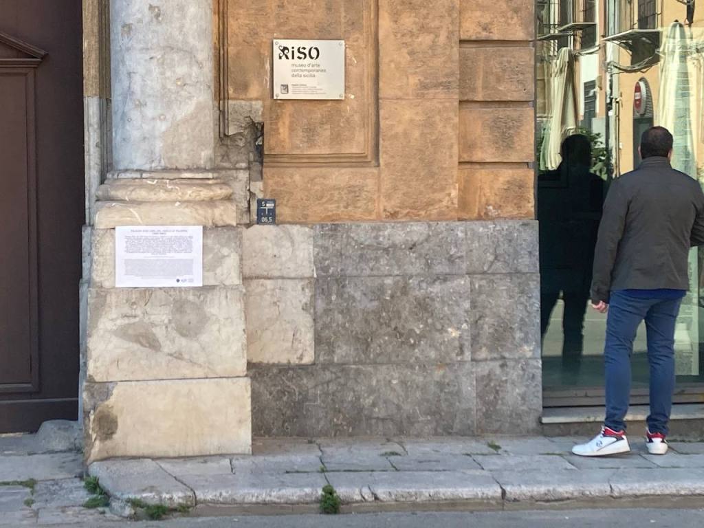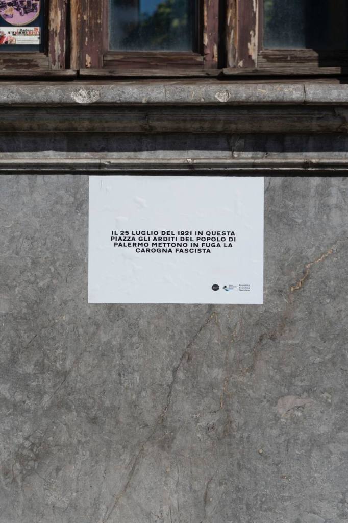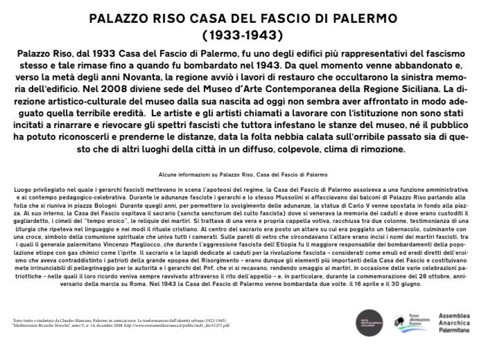 Il giorno della Liberazione abbiamo applicato una targa su Palazzo Riso, dal 1933 Casa del Fascio di Palermo, uno degli edifici più rappresentativi del fascismo stesso, che tale rimase fino a quando fu bombardato nel 1943. Nel 2008 diviene sede del Museo d’Arte Contemporanea della Regione Siciliana. La direzione artistico-culturale del museo dalla sua nascita ad oggi non sembra aver affrontato in modo adeguato quella terribile eredità. Le artiste e gli artisti chiamati a lavorare con l’istituzione non sono stati incitati a rinarrare e rievocare gli spettri fascisti che tuttora infestano le stanze del museo, né il pubblico ha potuto riconoscerli e prenderne le distanze, data la folta nebbia calata sull’orribile passato sia di questo che di altri luoghi della città in un diffuso, colpevole, clima di rimozione.