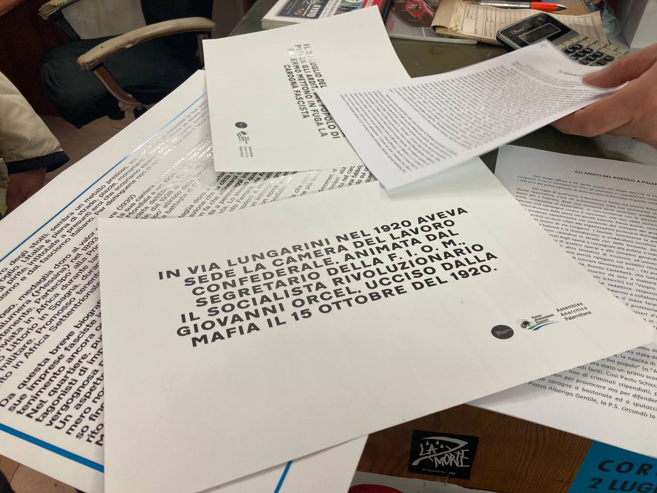 Azione in via Lungarini, dove nel 1920 aveva sede la Camera del Lavoro Sindacalista, animata dal Segretario della F. I. O. M, il socialista rivoluzionario Giovanni Orcel, ucciso dalla Mafia il 15 ottobre del 1920.