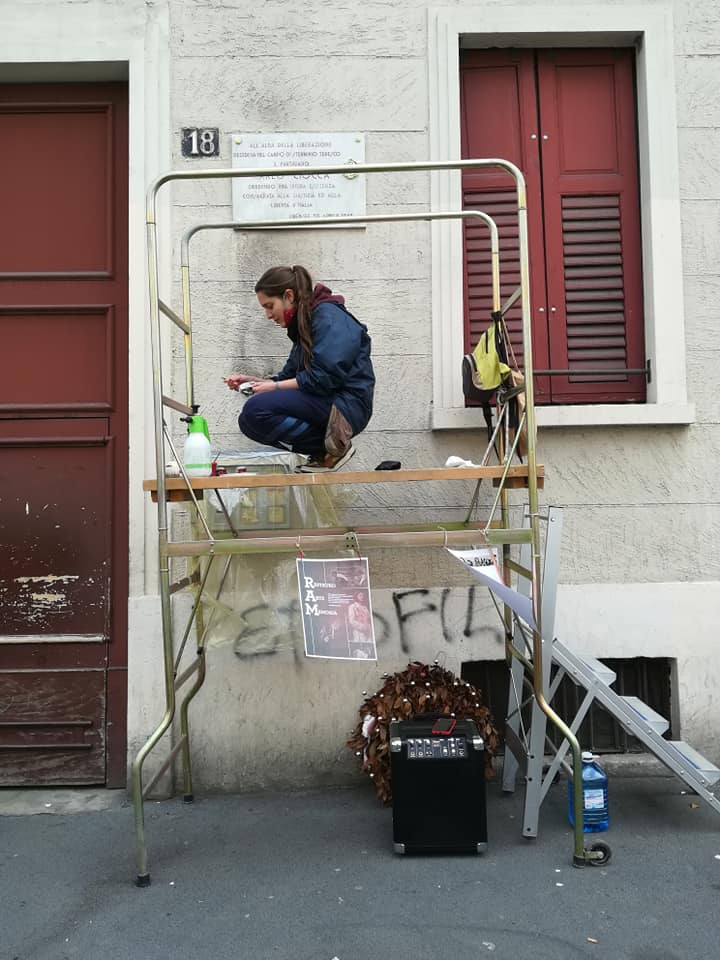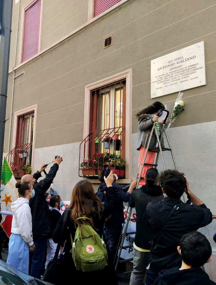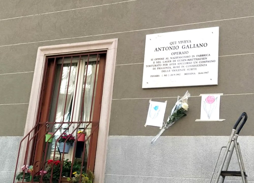 In preparazione alla nostra festa preferita siamo tornate in via Palmieri, una strada a cui siamo molto legate, per l’altissimo numero di lapidi che ricordano gli abitanti partigiani di quei palazzi di edilizia popolare e perché il nostro progetto ha preso lo slancio proprio da lì, dalla lapide di Carlo Ciocca, quando tre anni fa, la notte del 25 aprile 2018, i militanti di Forza Nuova che hanno la sede al numero 1 della via, una sede che Aler gli ha concesso e che non pensa di revocare, bruciarono la corona annerendo in buona parte la bella e antica lapide del numero 8. Pochi giorni dopo eravamo sul trabattello a pulirla e abbiamo fatto conoscenza con la sezione Anpi Stadera e col suo incredibile presidente di allora Gianfranco Bianchi, una sezione con cui collaboriamo ancora a diversi progetti e un uomo che ha accolto con entusiasmo disarmante la nostra proposta e il nostro lavoro. Un ritocco all’epigrafe e un segnale di presenza, Carlo Ciocca è stato vendicato, voi siete ancora lì, ma state attenti a quel che fate… Milano Sud è un cantiere aperto, lavoriamo con l’ardita sezione Stadera e con i preziosi compagni e compagne di Zam e Gta, le iniziative non si arrestano mai, anche le scritte razziste, le celtiche e varie svastiche sempre più storte sono state cancellate durante il restauro e il giorno successivo durante la posa di una nuova lapide nella via parallela, come operazione di pulizia del quartiere, l’unica pulizia ideologica moralmente accettabile. Una menzione speciale merita la posa di questa nuova lapide, dedicata a Antonio Galiano, operaio antifascista e comunista deportato nel campo di concentramento di Mauthausen dopo aver organizzato, all’interno della fabbrica dove lavorava, gli scioperi contro il nazifascismo. Galiano continuò la sua resistenza nel sottocampo di Gusen, attraverso il sabotaggio della produzione bellica. In seguito alle torture subite nel lager, perse gradualmente la memoria. Venne ritrovato in stato di semi incoscienza a Messina dove morì nel giugno del ’47 a causa di un collasso. Stadera è così, proletaria e industriosa, la memoria ha gambe forti su cui poter camminare.