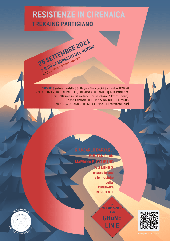 Ci incontreremo sabato 25 settembre alle 9.30 nel parcheggio di Prato all’albero a Borgo S. Lorenzo (FI). Seguiremo i sentieri partigiani facendo tappa a Capanna Sicuteri, alle sorgenti del Rovigo, a passo Ronchi di Berna, sul monte Carzolano (1184 metri), al Rifugio e alle Spiagge (ristorante / bar) per poi tornare al punto di partenza.