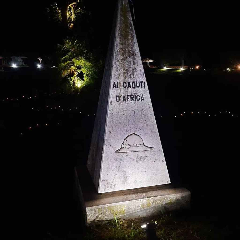 I giardini ospitano un piccolo obelisco in ricordo delle truppe coloniali con la dicitura “Ai caduti d’Africa” e una immagine dell’elmetto coloniale. Il rito magico, la comparsa della maschera antigas in dotazione al Reggio esercito distaccato in Africa, ha posto l’accento sull’uso di gas tossici, come l’iprite, durante le campagne coloniali risignificando così il monumento.