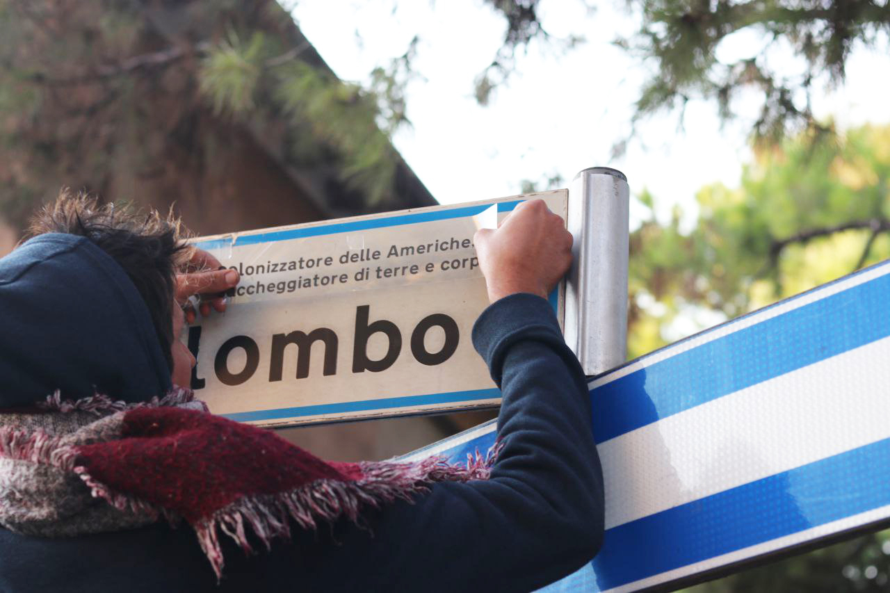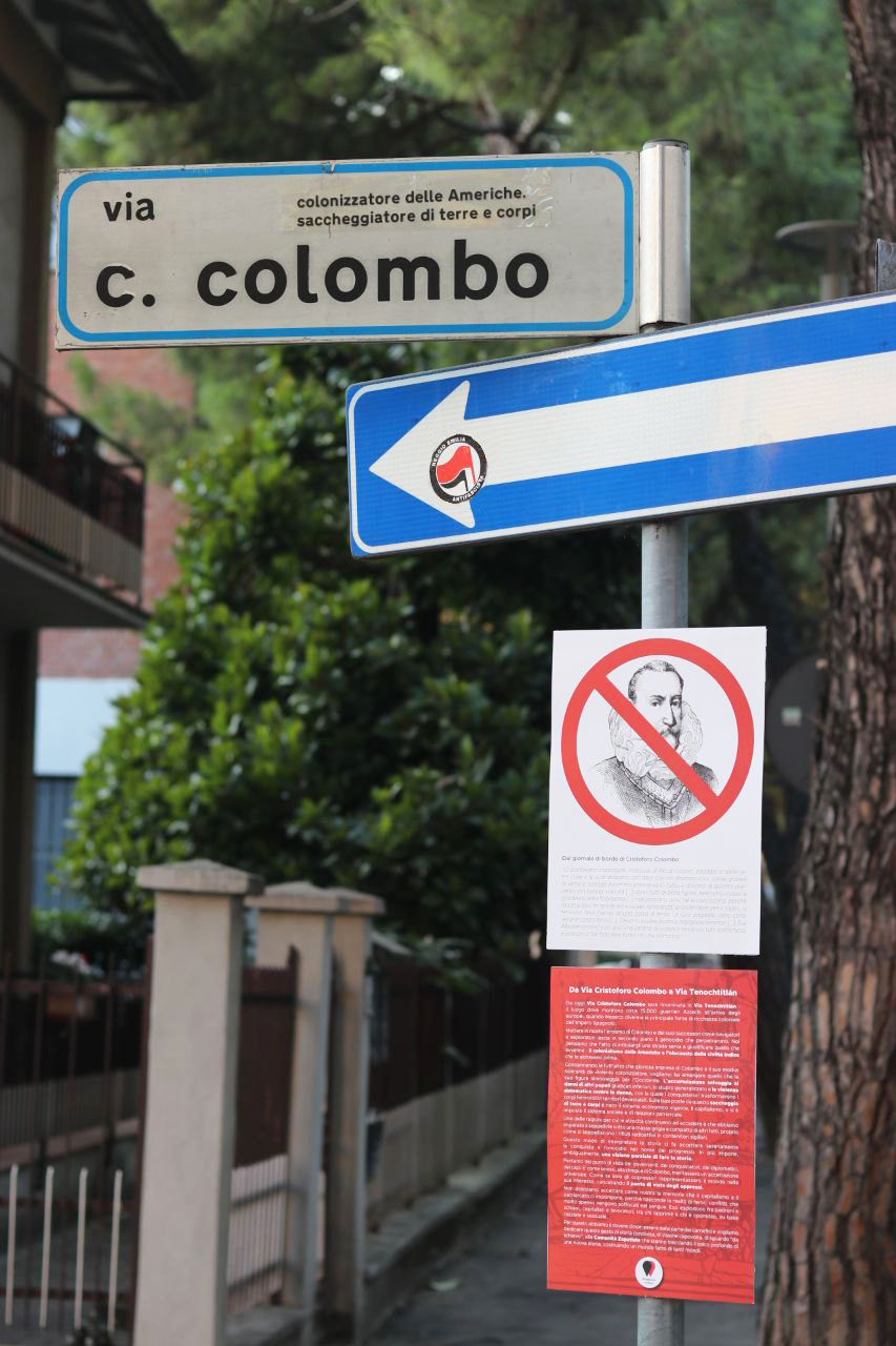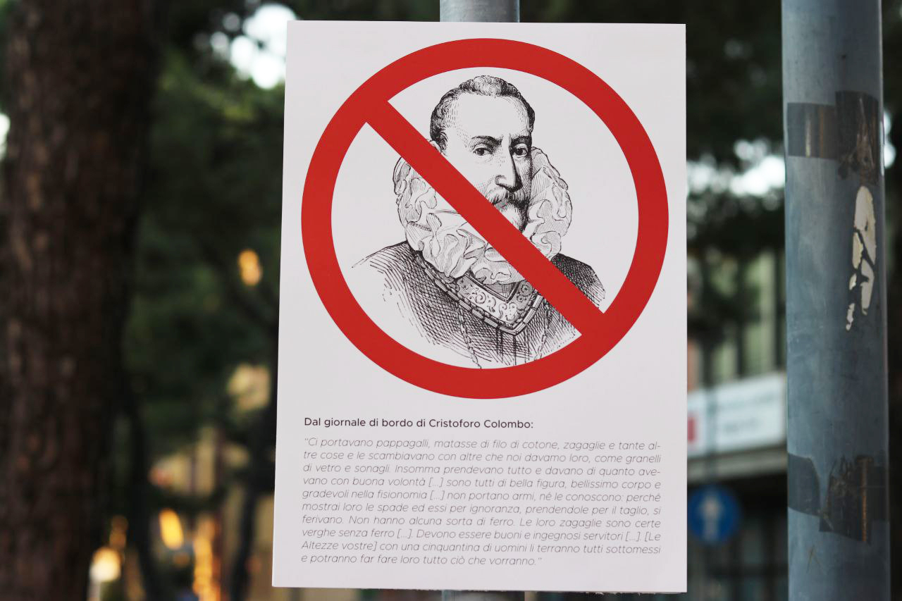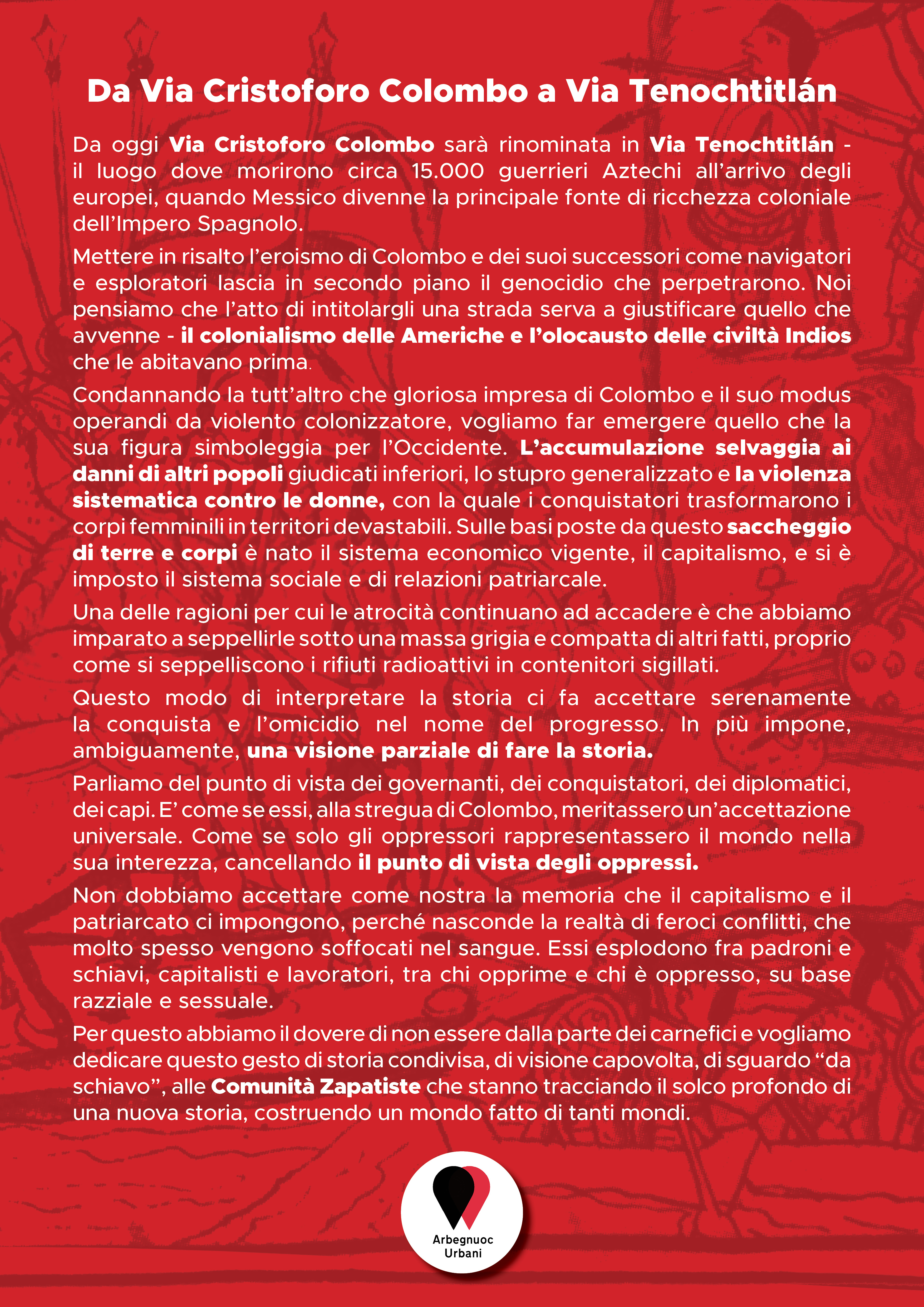 Mettere in risalto l’eroismo di Colombo e dei suoi successori come navigatori e esploratori lascia in secondo piano il genocidio che perpetrarono. Noi Arbegnuoc Urbani pensiamo che l’atto di intitolargli una strada serva a giustificare quello che avvenne, ovvero il colonialismo delle Americhe e l’olocausto delle civiltà Indios che le abitavano prima.