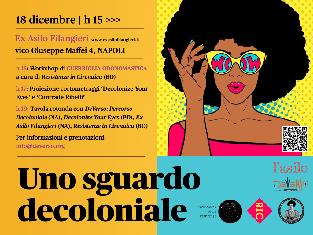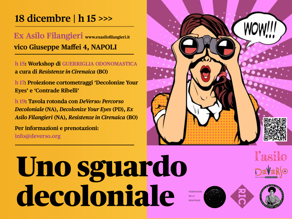 Il 18 dicembre vi aspettiamo a Napoli, all’ex Asilo Filangieri di vico Maffei 4, a partire dalle 15 per un workshop guerrigliero, per la proiezione di due cortometraggi ribelli e per una tavola rotonda in compagnia di DeVerso, Decolonize Your Eyes e il collettivo dell’ex Asilo Filangieri.