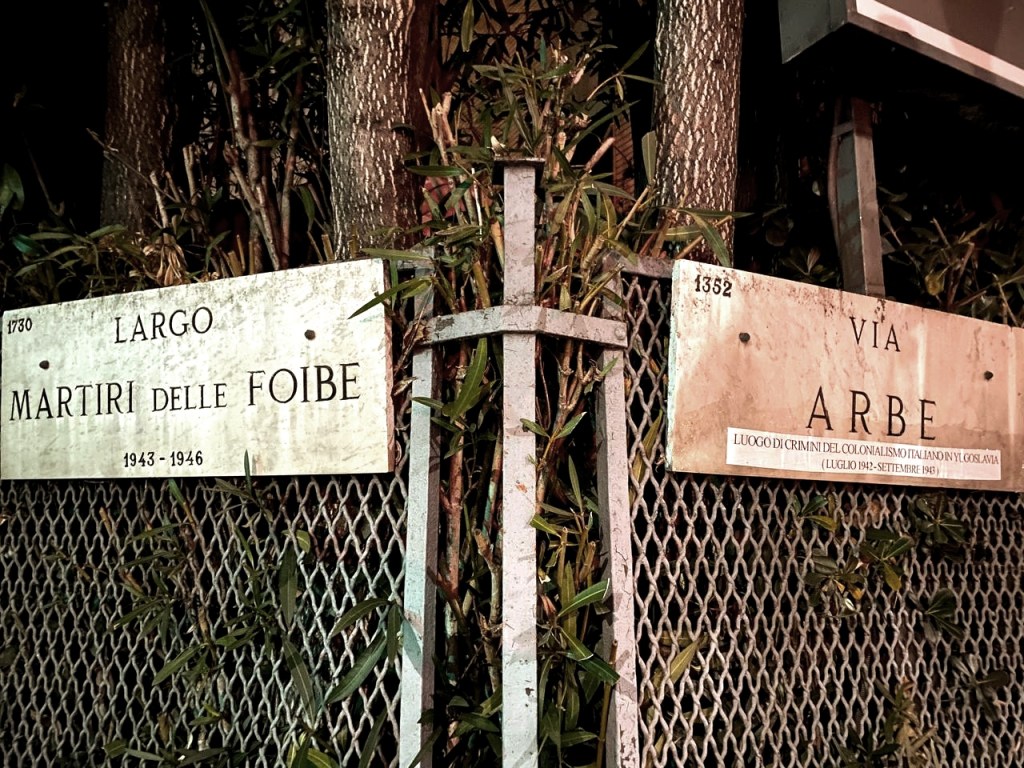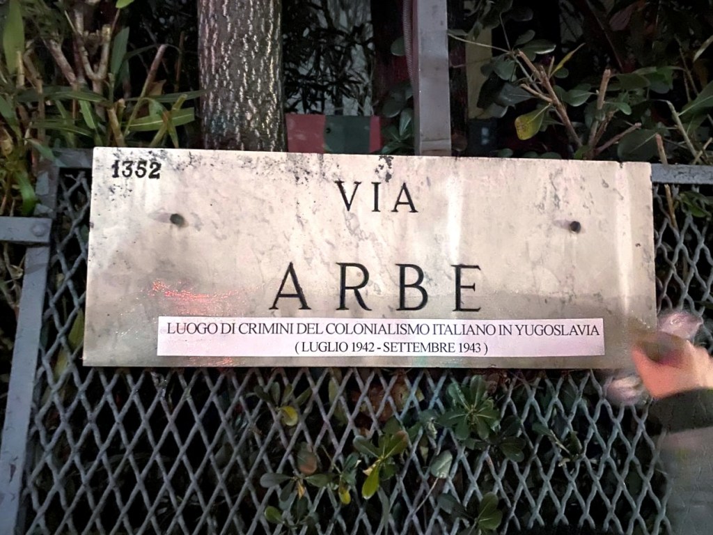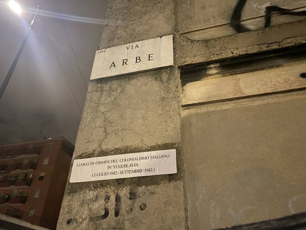 L’azione di guerriglia sulla via di Milano che porta il nome dell’isola dove uno dei campi di concentramento fascisti è stato costruito si muove nella stessa direzione. Ristabiliamo la verità sullo spazio urbano occupato dalla Storia che non vogliamo che sia celebrazione del dominio e della sopraffazione, altre parole per definire la celebrazione del fascismo che troppo spesso l’odonomastica cittadina ricorda. È necessario ricordare che quell’odonimo celebra uno sterminio. È una parte della storia che ci accompagna tutti i giorni quando attraversiamo via Arbe, piazzale Istria, via Pola. Ciò che ci celebra come popolo di martiri o di mediocri vincitori è qualcosa che non ci convince, è una parte della Storia viziata dalla nostalgia del revanscismo e dall’ipocrisia del neofascismo. Ciò che ricorda i crimini del nostro passato fascista e coloniale mette in equilibrio noi stessi con la nostra memoria. La guerriglia odonomastica è lo strumento privilegiato per pensare la Storia e colpire dritto al centro dello spazio che le nostre vite occupano.