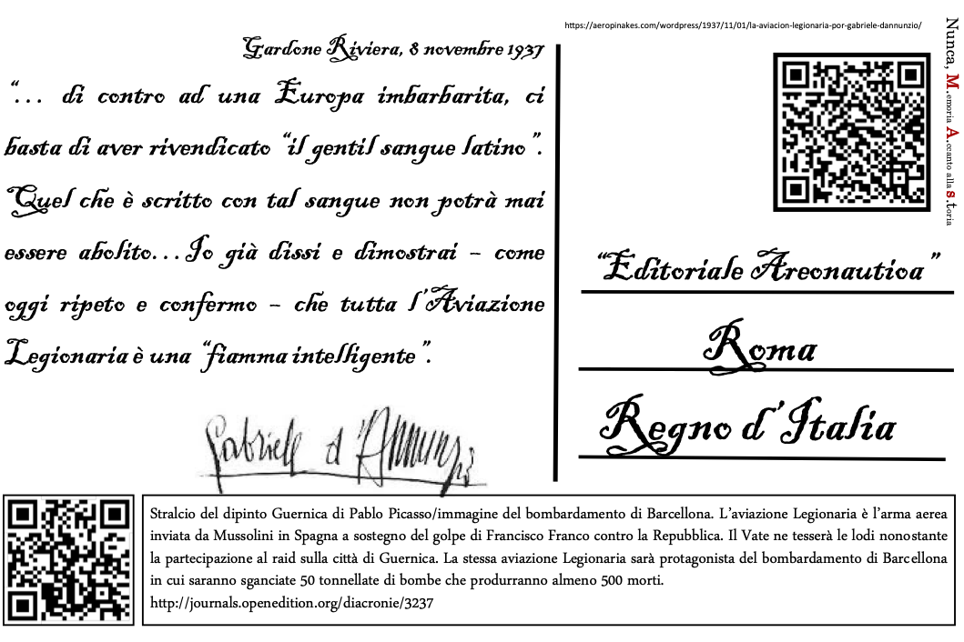 Nonostante il nome della città basca divenne quasi in tempo reale sinonimo d’ orrore grazie all’opera di Pablo Picasso esposta in quell’estate a Parigi, vi fu chi ebbe il coraggio di “cantare” le gesta degli aviatori italiani, ricoprendo di allori il viatico alla carneficina di Barcellona che di lì a pochi mesi si sarebbe prodotta.
