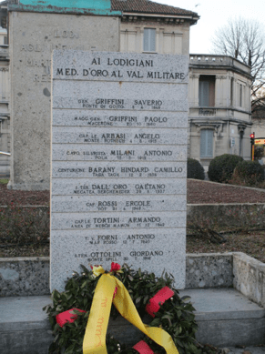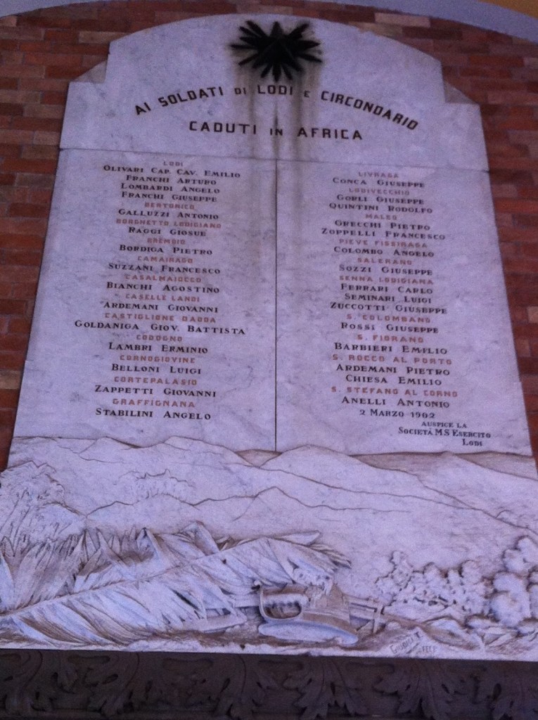 In Piazza Broletto, nel centro cittadino, a fianco del Duomo di Lodi e sotto i portici del palazzo che ospita gli uffici dell’amministrazione comunale, si trova una lapide dedicata “ai soldati di Lodi e circondiario caduti in Africa”. La lapide viene inaugurata il 2 marzo 1902 dalla Società M.S. Esercito Lodi; quest’ultima, fondata il 20 settembre 1880, trovava “Direzione e amministrazione presso la Sede Sociale in LODI in via Garibaldi n.13”. Tra i vari nomi dei soldati caduti troviamo quello di: