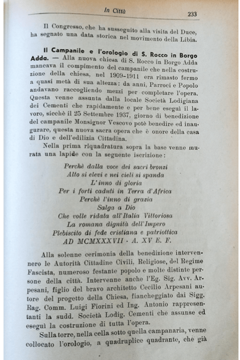 “Alla Chiesa di San Rocco, sita in Piazzale Barzaghi 21, in Borgo Adda mancava il compimento del campanile che nella costruzione della chiesa, nel 1909-1911 era rimasto fermo a quasi metà della sua altezza: da anni, Parroci e Popolo andavano raccogliendo mezzi per completare l’opera. Questa venne assunta dalla locale Società Lodigiana dei Cementi che rapidamente e per bene eseguì il lavoro, sicché il 25 settembre 1937, giorno di benedizione del campanile Monsignor Vescovo Calchi Novati potè benedire e inaugurare questa nuova sacra opera che è onore della casa di Dio e dell’edilizia cittadina.