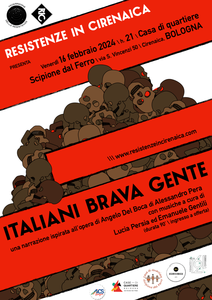 Nella settimana di avvicinamento al 19 febbraio – Yekatit 12 Resistenze in Cirenaica e gli Arbegnouc Urbani presentano Italiani Brava Gente, lo spettacolo teatrale ispirato all’opera di Giorgio Del Boca, rispettivamente a Bologna il 16 febbraio alle 21 e il 17 a Reggio Emilia alle 17:30 (a Casa Bettola) .