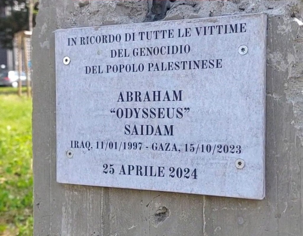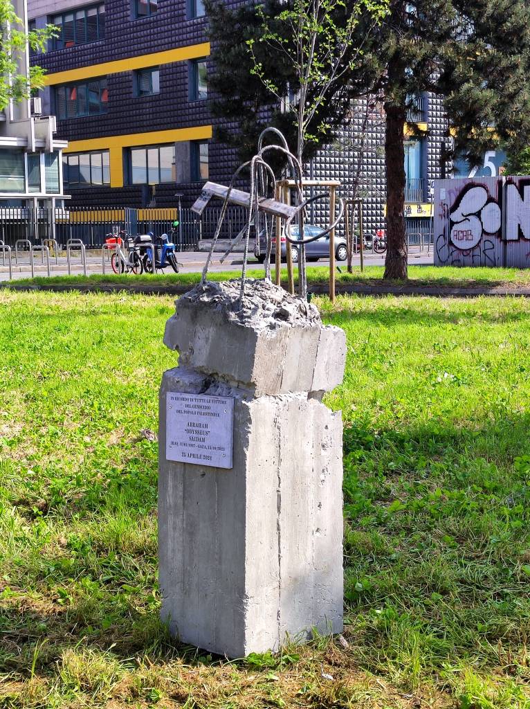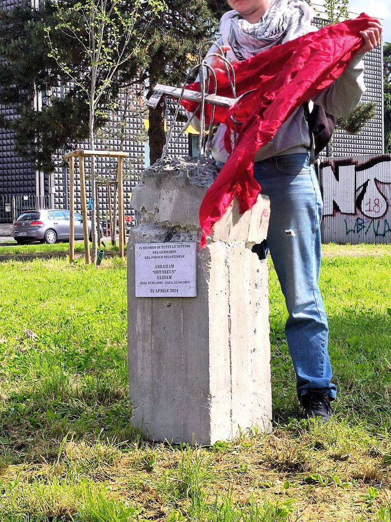 Erigere questo monumento è un modo di cominciare a fare i conti col nostro passato coloniale, prendendo in considerazione l’ultima operazione coloniale creata dalle potenze occidentali, una ferita ancora aperta e sanguinante dagli esiti catastrofici. È l’azione che vuole invertire una rotta secolare, quella di cedere simbolicamente parte del nostro territorio invece che colonizzare altre parti del mondo, il gesto di accogliere la sofferenza e la richiesta di aiuto di un altro popolo che non è necessariamente uguale a noi. E’ necessario che il nostro spazio urbano sia lo spazio che accoglie la loro diaspora, la nostra coscienza antifascista non può che essere la loro esigenza di vivere liberi e in pace, la nostra volontà di interrompere questo legame di sopraffazione coloniale è la loro lotta per la fine dell’occupazione.