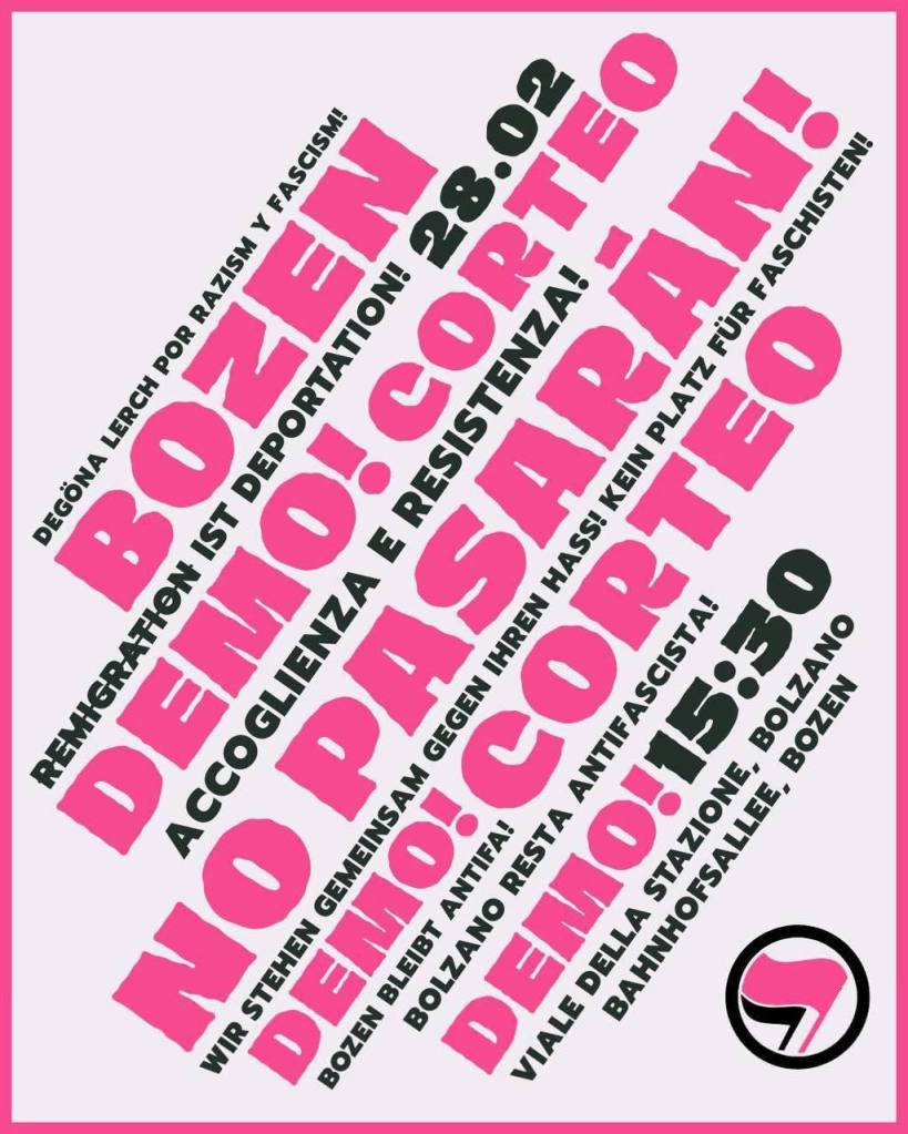 AUFRUF ZUR MOBILISIERUNG IM HINBLICK AUF DIE ANTIFASCHISTISCHE DEMONSTRATION AM SAMSTAG, 28.FEBRUAR, IN BOZEN